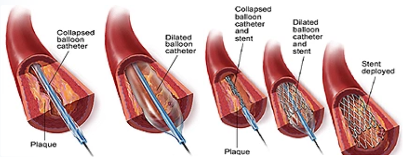 Koronární angioplastika – před ošetřením vlevo a po roztažení balónkem a zavedení stentu vpravo