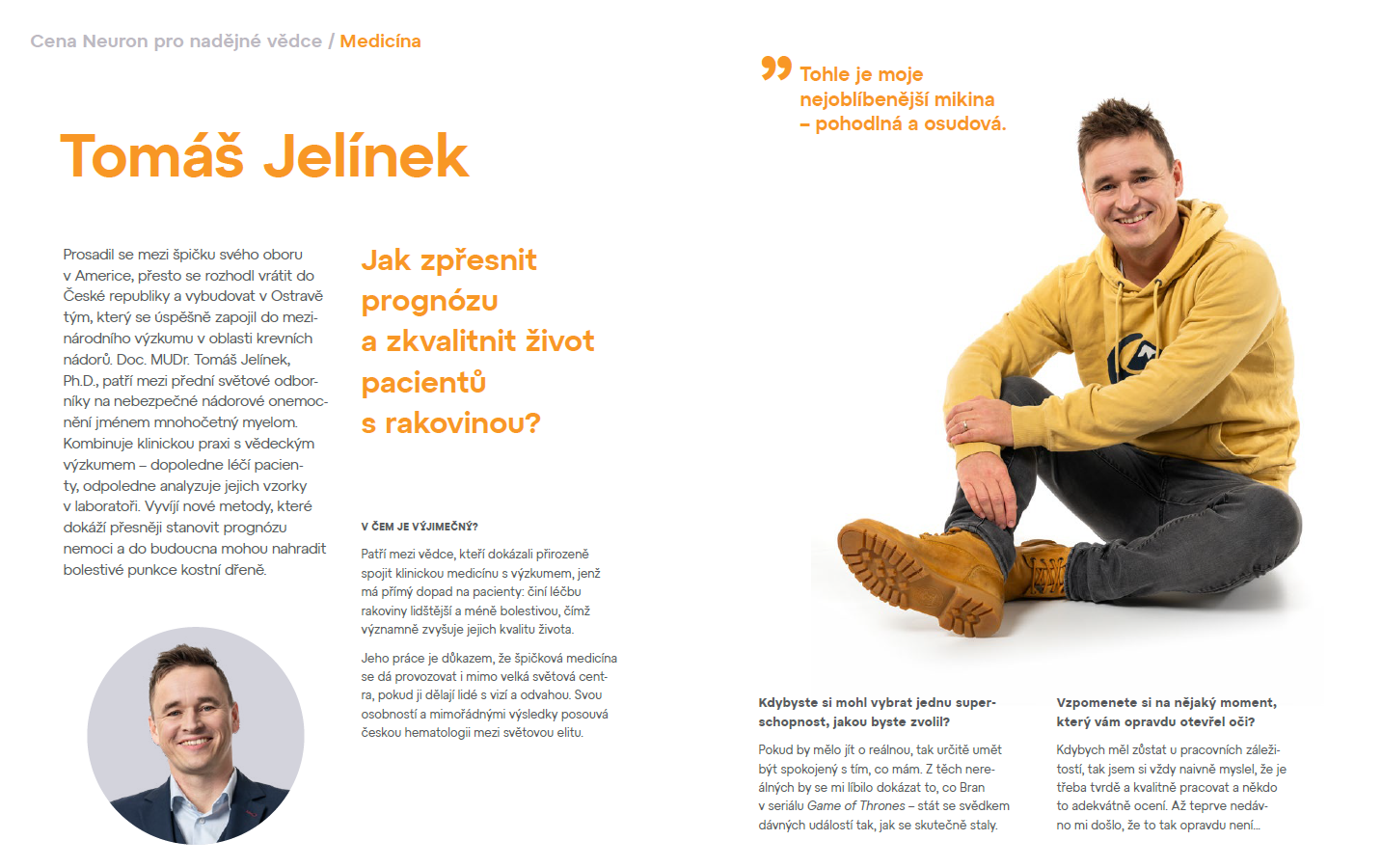 Doc. MUDr. Tomáš Jelínek, Ph.D., zástupce přednosty pro vědu a výzkum Kliniky hematoonkologie FNO a LF OU, byl oceněn Cenou Neuron pro nadějné vědce v oblasti medicíny. Toto nejprestižnější české vědecké ocenění uděluje Nadace Neuron za výjimečný přínos vědeckému poznání a spojení klinické medicíny s inovativním výzkumem s přímým dopadem na zdraví pacientů.