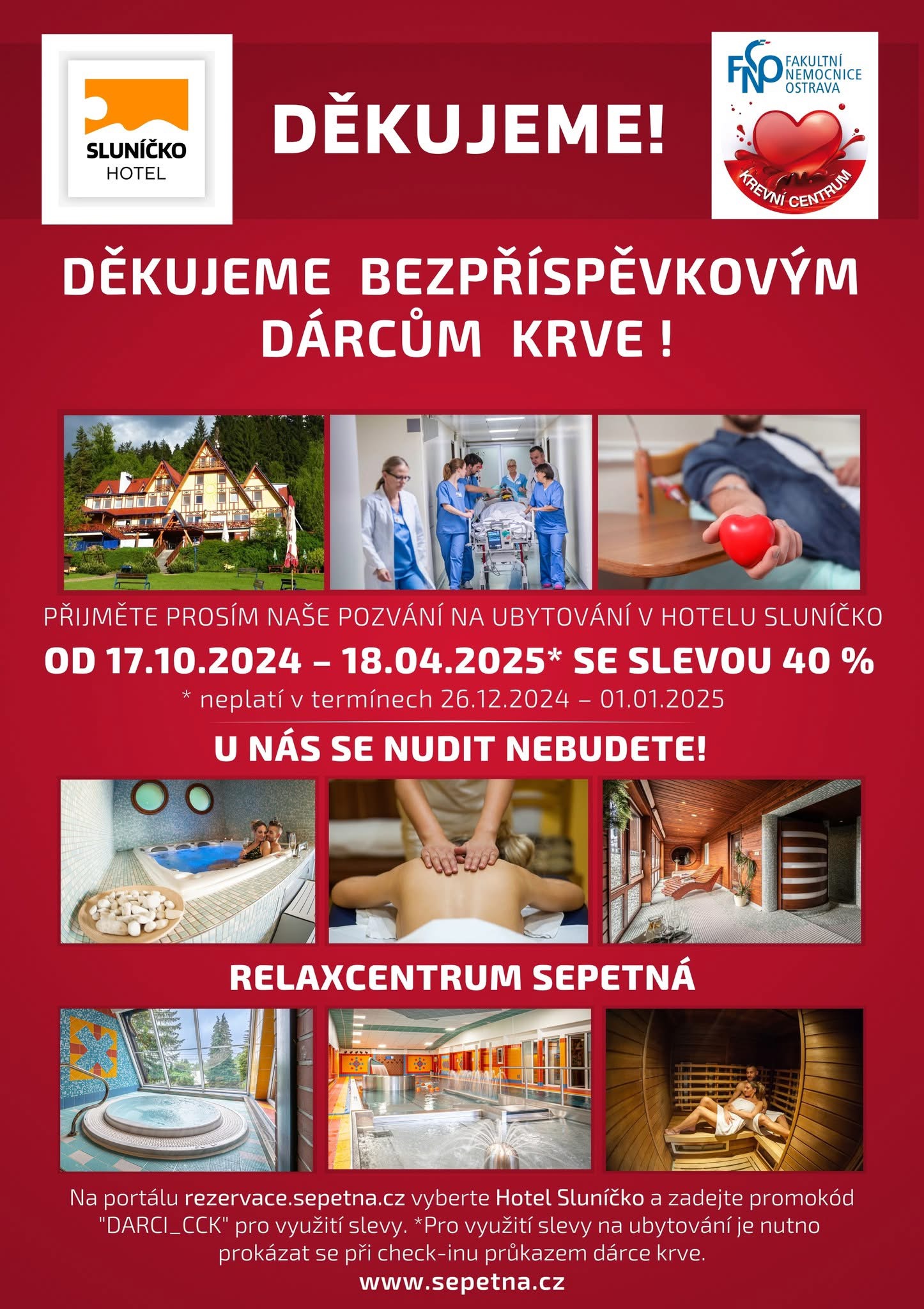 Platnost akce 17.10.2024 – 18.4.2025, nutno se prokázat Průkazem dárce krve. Sleva platí pro všechny ubytované.