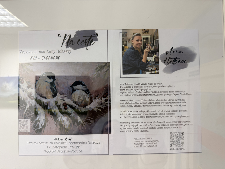 Výstava představuje výběr obrazů malířky Anny Holtsevy, která skrze malbu a kresbu zachycuje emoce, ticho a jemné okamžiky každodennosti. Její tvorba propojuje dětskou spontánnost s citem pro detail a inspirací klasickými mistry. Výstavu můžete navštívit do 31. ledna 2026 v Galerii Života v Krevním centru FN Ostrava.