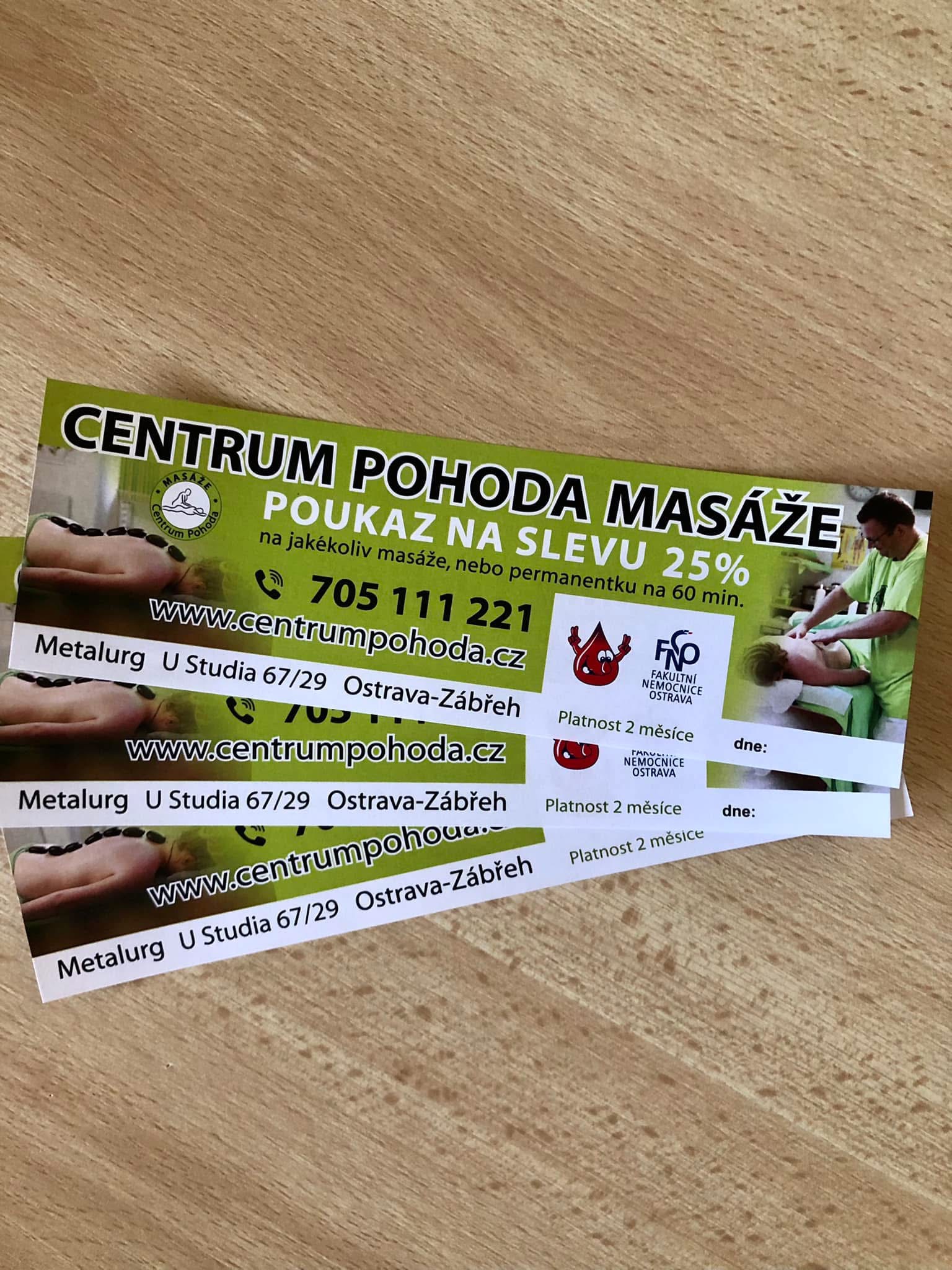 Na Pokladně KC si vyzvedněte poukázku na 25% slevu na jakékoliv masáže nebo permanentku na 60minut