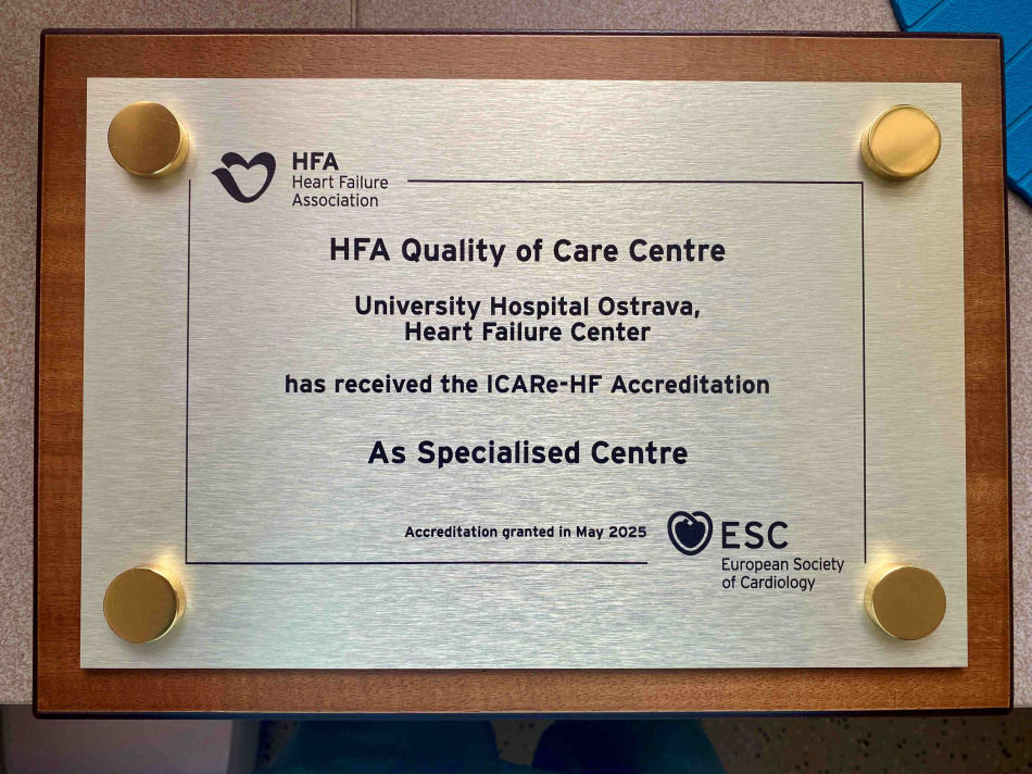 Ambulance srdečního selhání Interní a kardiologické kliniky FN Ostrava a LF OU je nově držitelem prestižního mezinárodního certifikátu Quality of Care Centre in Heart Failure (as a Specialised Centre), který uděluje Evropská kardiologická společnost.