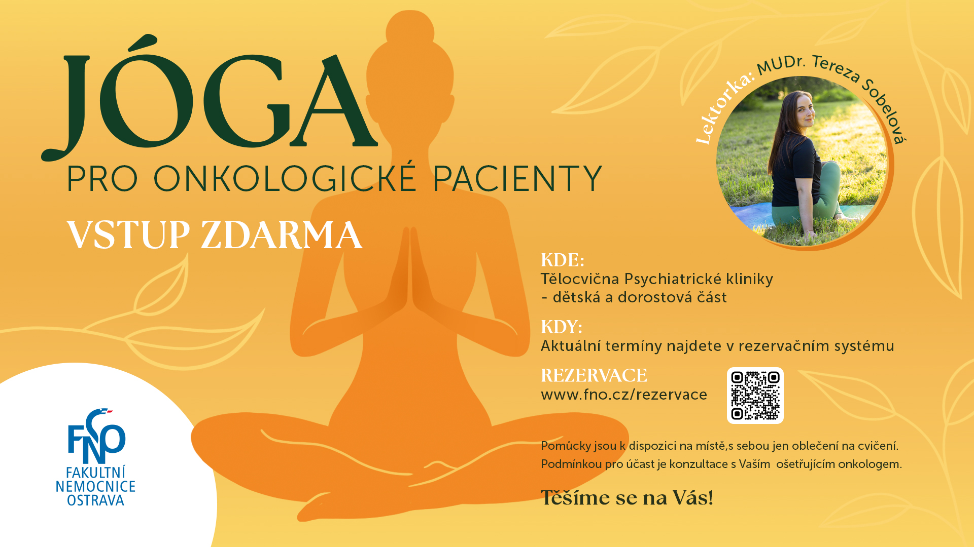 Onkologičtí pacienti FN Ostrava mají nově možnost účastnit se speciálních lekcí jógy, které jsou přizpůsobené jejich zdravotnímu stavu a individuálním potřebám. Projekt Onko jóga přináší do nemocnice mladá lékařka zdejší kliniky MUDr. Tereza Sobelová, čerstvá absolventka Lékařské fakulty Ostravské univerzity.