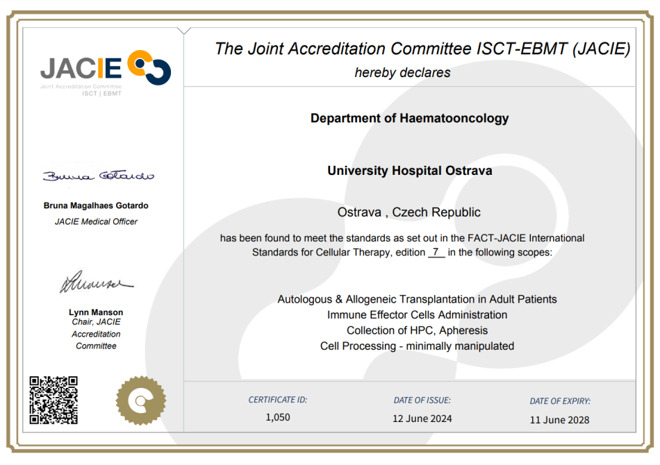 Klinika hematoonkologie FN Ostrava a LF OU (KHO) je pátým centrem svého druhu v České republice, které získalo prestižní akreditaci JACIE. Dokument potvrzuje, že pracoviště splňuje vysoké mezinárodní standardy kvality péče. Klinika díky tomu může provádět transplantace krvetvorných buněk a podávat pacientům moderní buněčné terapie bez auditů farmaceutických firem.