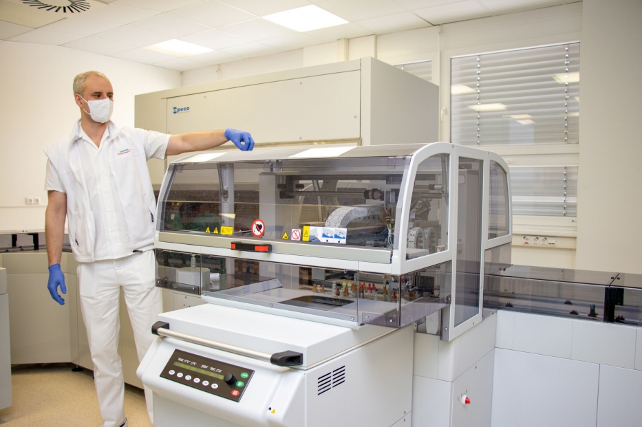 Zásah lidské ruky do celého analytického procesu vzorku krve či moči je teď naprosto minimální. Laicky řečeno - linka provede vyšetření od A do Z sama. „Laborant vloží zkumavku s biologickým materiálem do vstupního modulu, dopravní pás ji přesune do centrifugy, která provede automaticky oddělení séra nebo plazmy od krevních elementů a následně je vzorek opět dopravním pásem přesunut do analyzátorů, které jej zpracují. Po provedení všech požadovaných analýz se vzorek přesouvá do lednice,“ přiblížil zpracování vzorku přednosta Ústavu laboratorní medicíny prof. MUDr. David Stejskal, Ph.D., MBA.