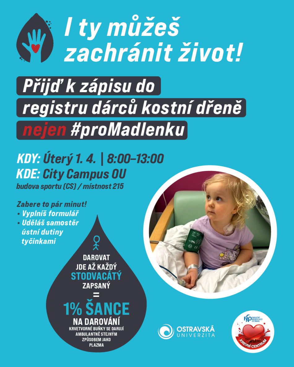 Ostravská univerzita společně s FN Ostrava zřizuje mimořádné náborové místo do registru dárců kostní dřeně. Zájemci mohou přijít v úterý 1. dubna mezi 8. až 13. hodinou do City Campusu OU na Černé louce v ostravském centru. Podpoří tak nejen malou Madlenku, která trpí vzácnou poruchou krvetvorby a jejíž příběh byl v poslední době medializován, ale i další pacienty čekající na transplantaci kostní dřeně.