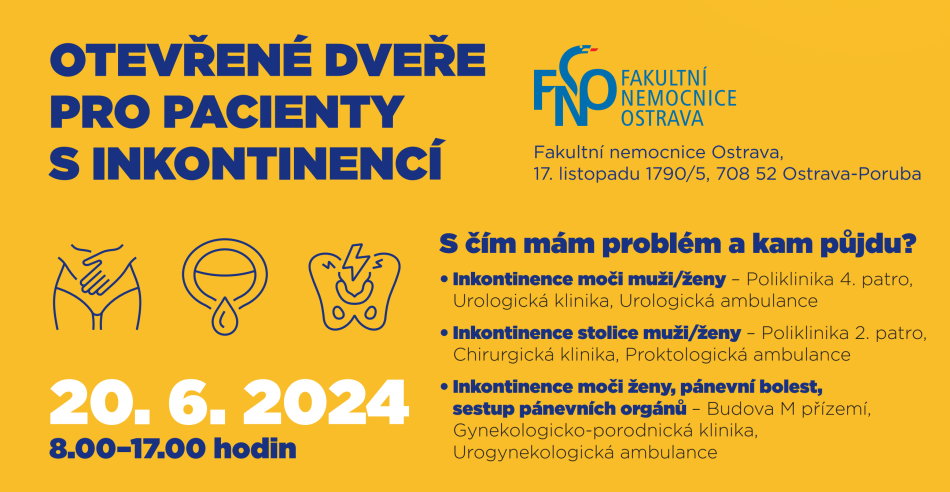 Fakultní nemocnice Ostrava pořádá ve čtvrtek 20. 6. 2024 od 8.00 do 17.00 hodin v rámci Světového týdne kontinence akci Otevřené dveře pro pacienty s inkontinencí.
