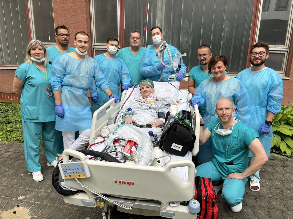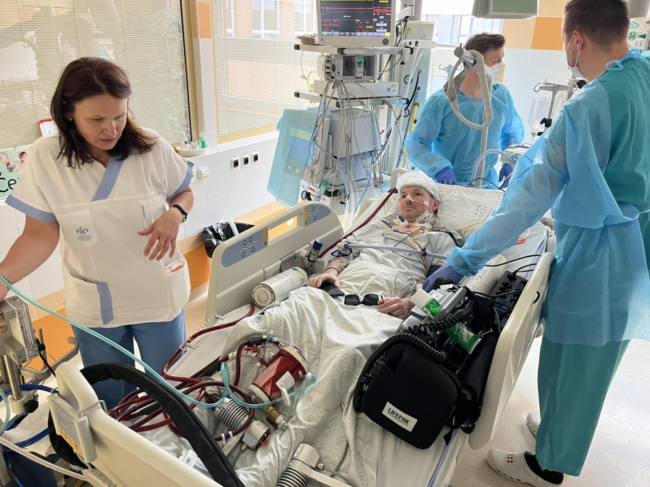 Tým zdravotníků 3. oddělení resuscitace a intenzivní medicíny Kliniky anesteziologie, resuscitace a intenzivní medicíny FNO a LF OU se rozhodl zlepšit a podpořit psychiku pacienta, který je už téměř čtvrt roku plně závislý na přístrojové podpoře. Společně s kolegy z Kardiochirurgického centra, kteří chod ECMO přístroje zajišťují, jej z nemocničního boxu na lůžku bezpečně vyvezli na dvůr nemocnice.