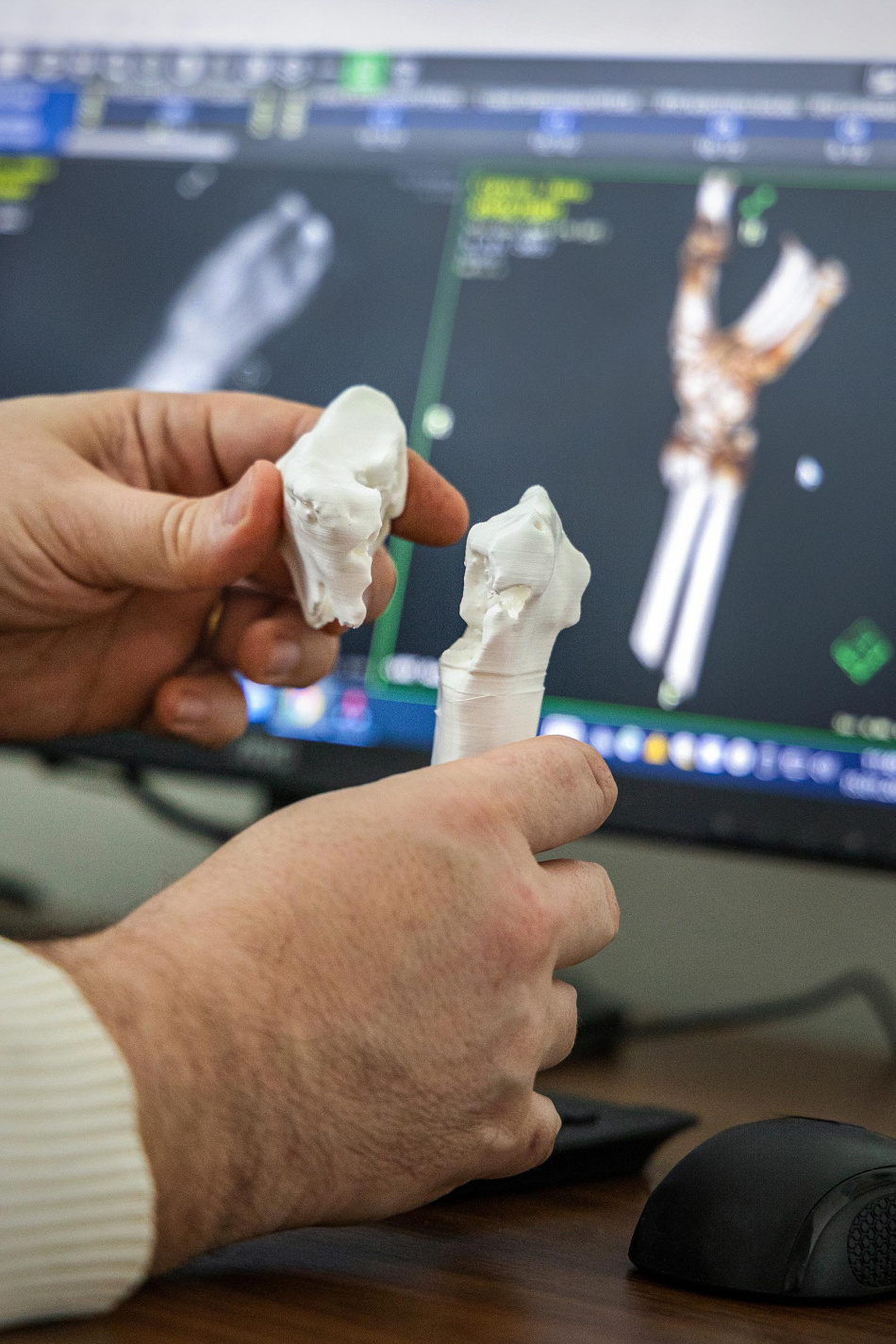 Ve FN Ostrava se 3D modelům kostí kromě docenta Douši věnuje MUDr. Jiří Szeliga s MUDr. Tomášem Boskem z Kliniky úrazové chirurgie a ortopedie a MUDr. Ján Hrubovčák z Chirurgické kliniky. Posledně jmenovaný se s 3D tiskem zlomenin seznámil na stáži na 1. chirurgické klinice Všeobecné fakultní nemocnice v Praze a 1. lékařské fakulty Univerzity Karlovy. „Naučit se pracovat s 3D tiskárnou trvalo stovky hodin. Z množství informací, které poskytuje CT vyšetření, musím vybrat ty, které se týkají kostí. Jedná se o takzvanou segmentaci. Vysegmentované hodnoty pak z medicínského programu musím převést do programu, kterému rozumí 3D tiskárna,“ vysvětluje doktor Hrubovčák.