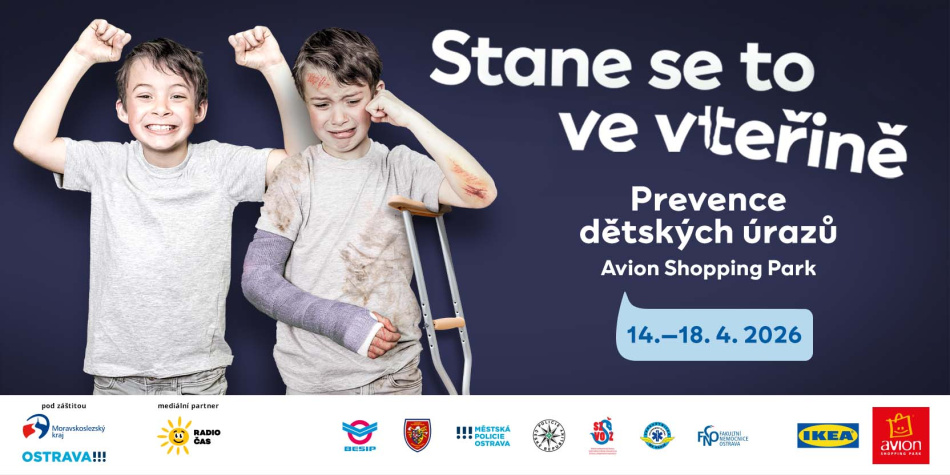 Naučme děti převzít zodpovědnost za svou bezpečnost a zdraví! Přijďte s nimi na akci "Prevence dětských úrazů aneb Stane se to ve vteřině", která se koná od 14. do 18. dubna 2026 v areálu nákupního centra Avion Shopping Park Ostrava. Dopolední program od 14. do 17. 4. je určen žákům prvního stupně základních škol. Pro rodiče s dětmi je nachystaný pestrý program v sobotu 18. dubna 2025. Od 10 do 18 hod. je v prostorách Avionu ve spolupráci se složkami integrovaného záchranného systému a dalšími organizacemi připravena zábavná edukační trasa a soutěžní stezka, kde si děti ověří své vědomosti a získají praktické dovednosti. Součástí akce je i ukázka terénní techniky. Říká se, že „svět patří připraveným“, tak na něj připravme i naše děti a přispějme tak ke snížení dětské úrazovosti.