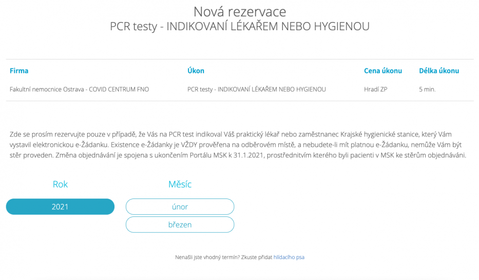 Od února začne platit nový systém objednávání k provedení indikovaného testu na zjištění covid pozitivity metodou PCR. Zatímco nyní pacient s podezřením na koronavirus dostane datum a čas odběru přidělen, od 1. února 2021 si termín odběru zarezervuje sám. Nejdříve ale musí být ke stěru, stejně jako doposud, doporučen svým praktickým lékařem, případně hygienickou stanicí, kteří jej zavedou do národního systému a vystaví e-žádanku. Změna objednávání souvisí s napojením na celostátní rezervační systém.