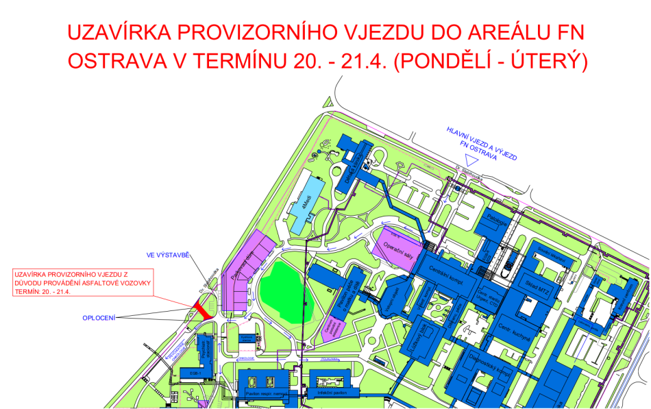 Ve dnech 20. a 21. dubna 2026 (Po, Út) bude z důvodu asfaltování komunikace u parkovacího domu (rozšíření křižovatky z ulice Dr. Slabihoudka) uzavřen provizorní vjezd do FN Ostrava.
