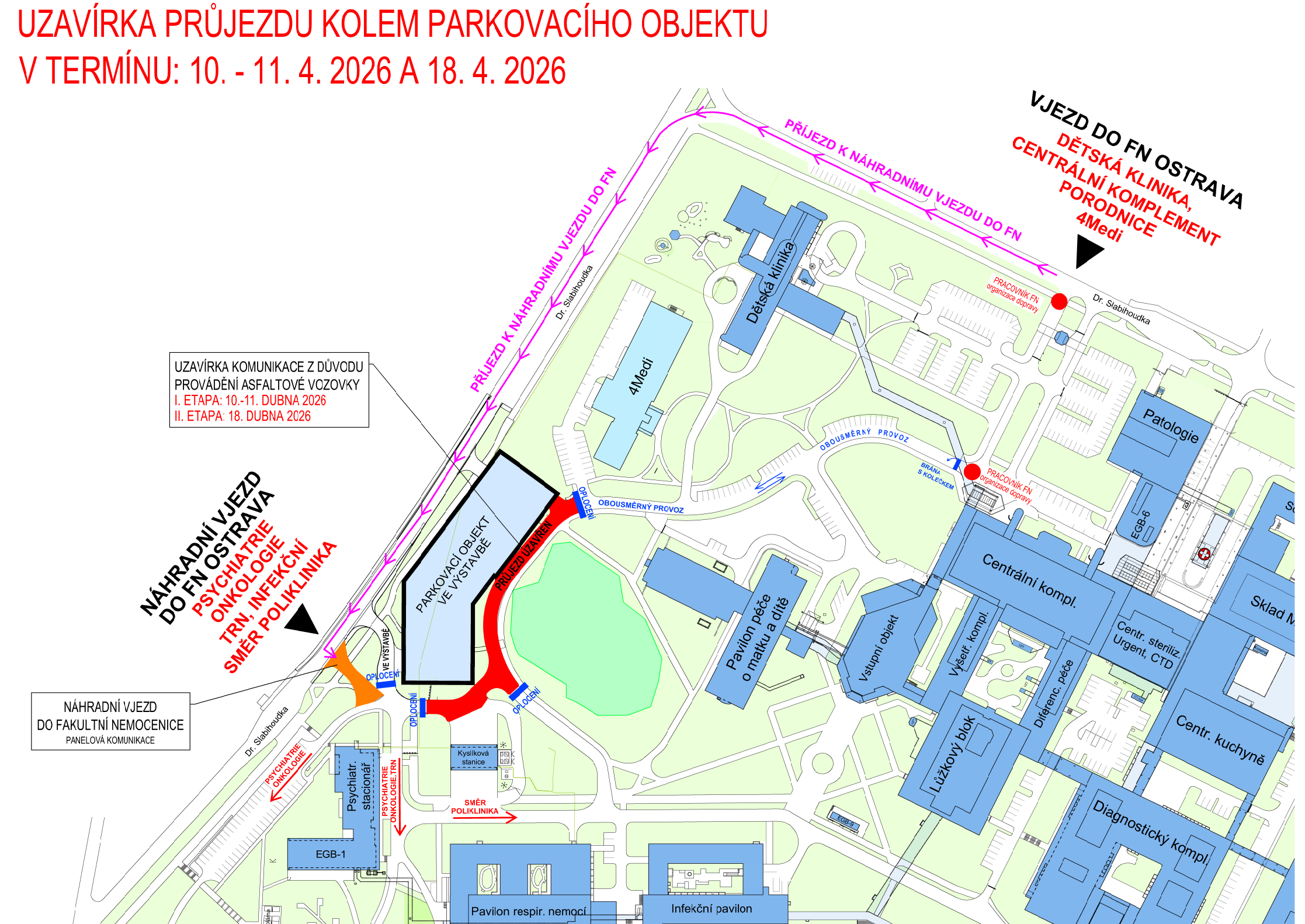 Ve dnech 10., 11. a 18. dubna 2026 (pá, so, so) bude z důvodu asfaltování komunikace uvnitř areálu FNO zcela uzavřen průjezd pro vozidla podél parkovacího domu (viz na mapce červeně). Boční panelový vjezd/výjezd do FNO z ul. Dr. Slabihoudka (u staveniště parkovacího domu) bude i nadále průjezdný pro všechna osobní vozidla a sanitky tak, aby bylo možné dojet k budovám Psychiatrické kliniky, Kliniky onkologické, Kliniky hematoonkologie, Kliniky nukleární medicíny, Oddělení plicních nemocí a TBC, Kliniky infekčního lékařství, Kožního oddělení a dále směrem k Poliklinice. Provoz po komunikaci v úseku od hlavního vjezdu FNO po budovu 4Medi bude po dobu uzavírky obousměrný.