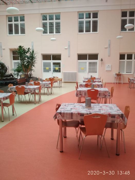 Aby se pacienti neshlukovali v jídelně, jídlo je jim nošeno na pokoje. Protože je nyní uzavřena i tělocvična, rehabilitace se provádějí přímo na pokojích. Pacienti musí mít roušku kdykoliv opustí pokoj.