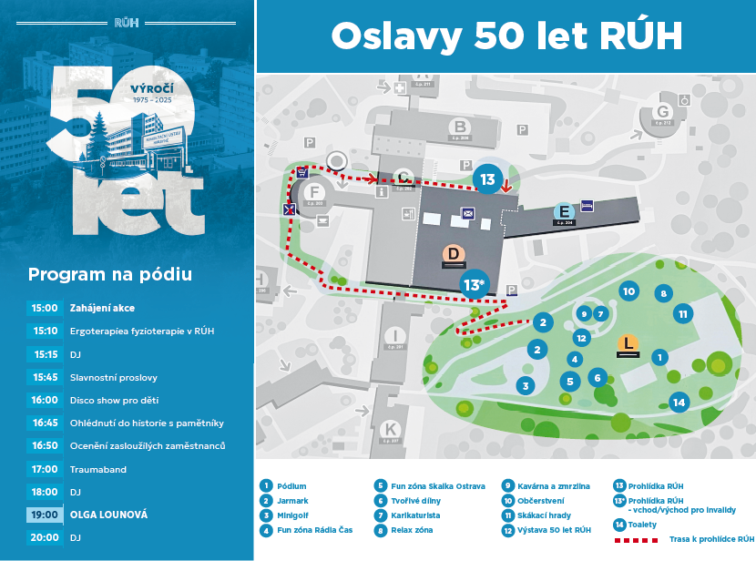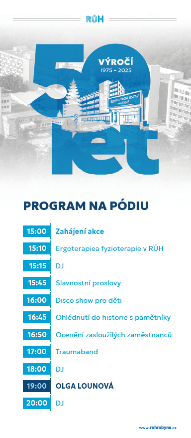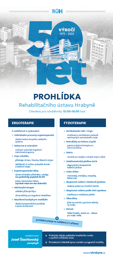 Přijměte naše pozvání na Oslavu 50 let Rehabilitačního ústavu Hrabyně – půl století pomoci, pokroku a lidského přístupu. Akce se koná ve čtvrtek 12. června 2025, od 15:00 do 20:00 hodin v Rehabilitačním ústavu Hrabyně, sportovně-relaxačním areálu CSS, Hrabyně 204.