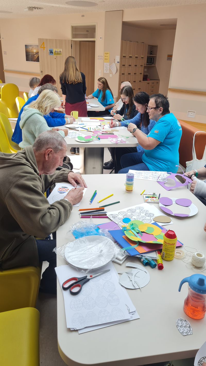 DOBROVOLNICKÉ CENTRUM ADRA - Dobrovolnické centrum Adra opakovaně realizuje kreativní tvoření pro pacienty Kliniky dětského lékařství a pro pacienty Psychiatrického oddělení. Dobrovolníci dochází za dětmi v rámci těchto kreativních dílen hlavně proto, aby pomohli dětem zpestřit jejich pobyt v nemocnici, rozptýlit jejich myšlenky týkající se vytržení z domácího prostředí a obav z léčby. Často se těchto dílen účastní i rodiče hospitalizovaných dětí, takže pro ně je to také příjemné odreagování, že má jejich dítě nějakou aktivitu a rodič si může na chvíli odpočinout a popovídat si s někým jiným. Kreativní tvoření na OP přináší pacientům nové podněty a ozvláštnění jejich dnů strávených v nemocnicích a tím napomáhá ke zlepšení jejich psychického stavu. Během tvoření si dobrovolníci s pacienty povídají a mohou jim pomoct zmírnit jejich pocit osamění a strávit společně příjemné chvíle.
