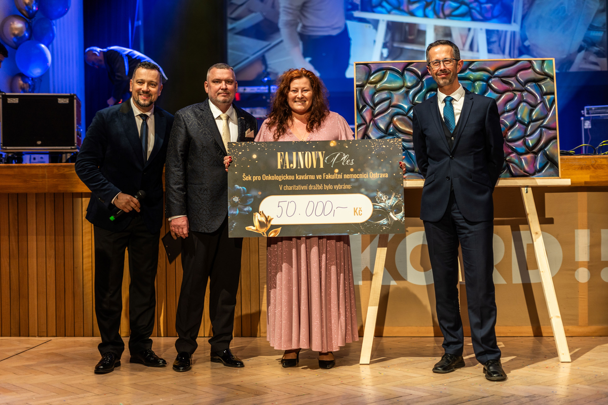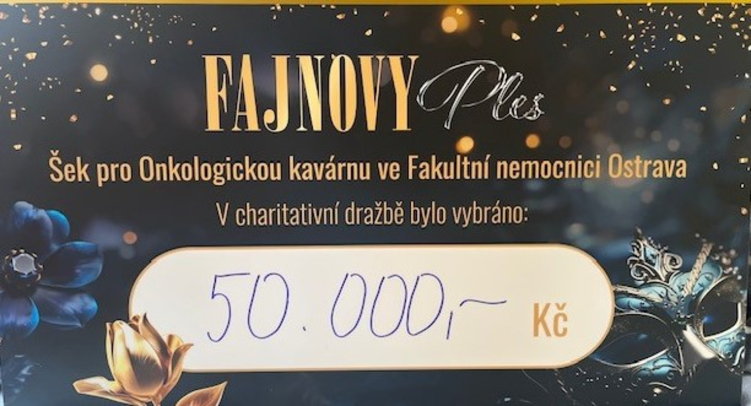 „Fajnový ples“ – dne 8.3.2025 se konal od 19 h. v DK Akord Ostrava ples, který organizovala firma REVIZIO s.r.o. Součástí plesu byla také charitativní dražba dřevěného obrazu, který vyrobil mladý muž pan Štěpán Musil a věnoval ho pro tyto charitativní účely. Obrazil vydražil prim. MUDr. Jan Burda z Brněnské soukromé kliniky SurGal Clinic s.r.o., za neuvěřitelných 50 000 Kč! Tato částku byla darovaná Onkologické kavárně FN Ostrava, která ji využila na nákup nového kávovaru.