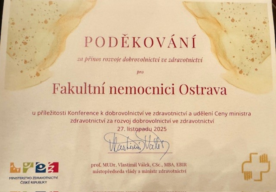 Listopad 2025 - Dne 27. listopadu 2025 se v Emauzském opatství v Praze uskutečnil druhý ročník Konference k dobrovolnictví ve zdravotnictví pořádaný Ministerstvem zdravotnictví. Součástí programu bylo již čtvrté slavnostní předání Ceny ministra zdravotnictví za rozvoj dobrovolnictví ve zdravotnictví za rok 2025. Této konference se zúčastnily za Fakultní nemocnici Ostrava náměstkyně ředitele pro ošetřovatelskou péči PhDr. Andrea Polanská, MBA a koordinátorka dobrovolnické činnosti Bc. Simona Honsová.