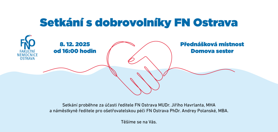 Prosinec 2025 – Dne 8.12.2025 proběhlo za účasti ředitele Fakultní nemocnice Ostrava MUDr. Jiřího Havrlanta, MHA každoroční poděkování všem dobrovolníkům působícím v našem zdravotnickém zařízení. Dobrovolníci mají svou nezastupitelnou roli a vedení Fakultní nemocnice ocenilo jejich neúnavnou podporu našich pacientů a našeho zdravotnického zařízení. Dobrovolníci jsou srdcem naší nemocnice.